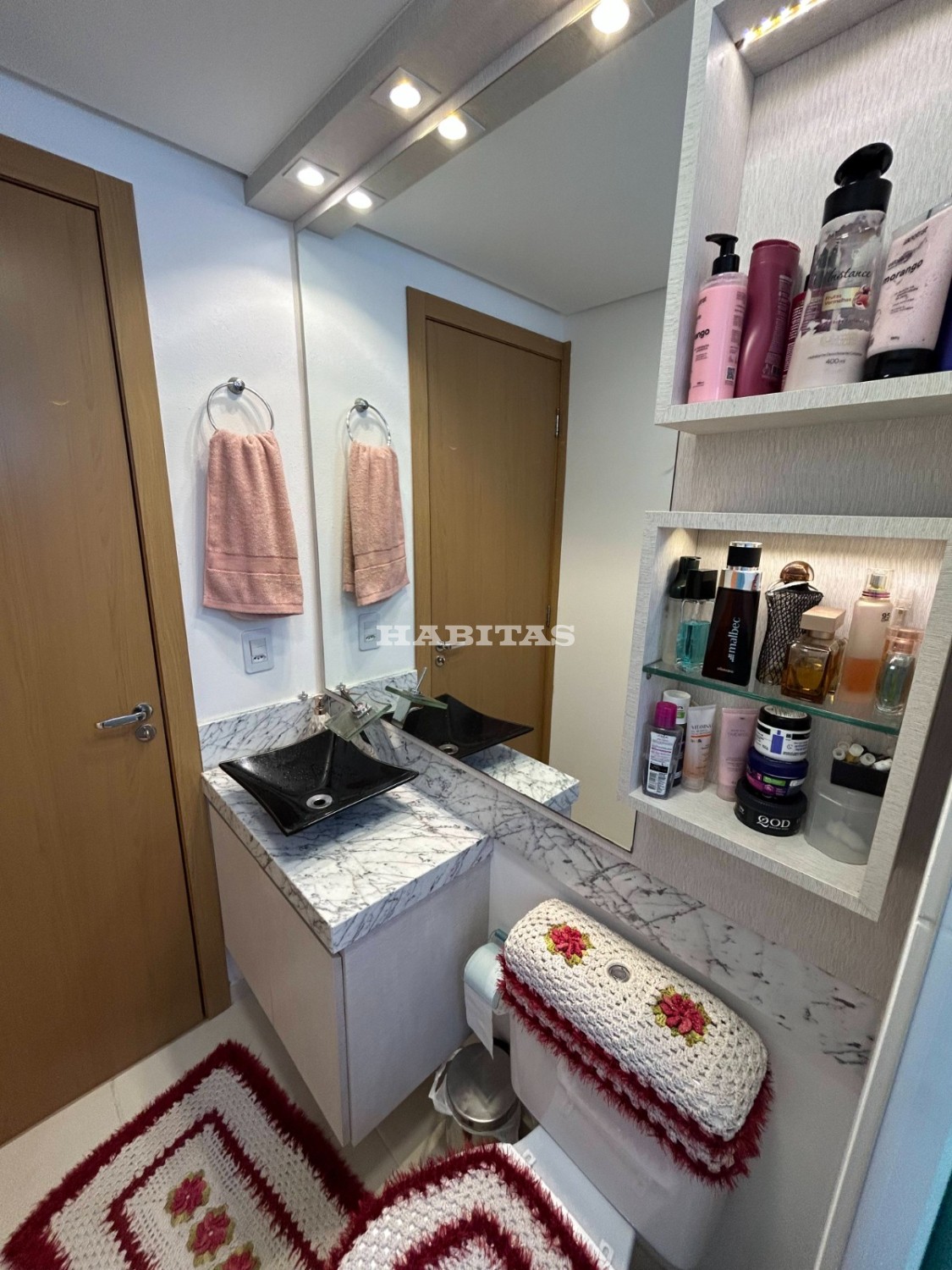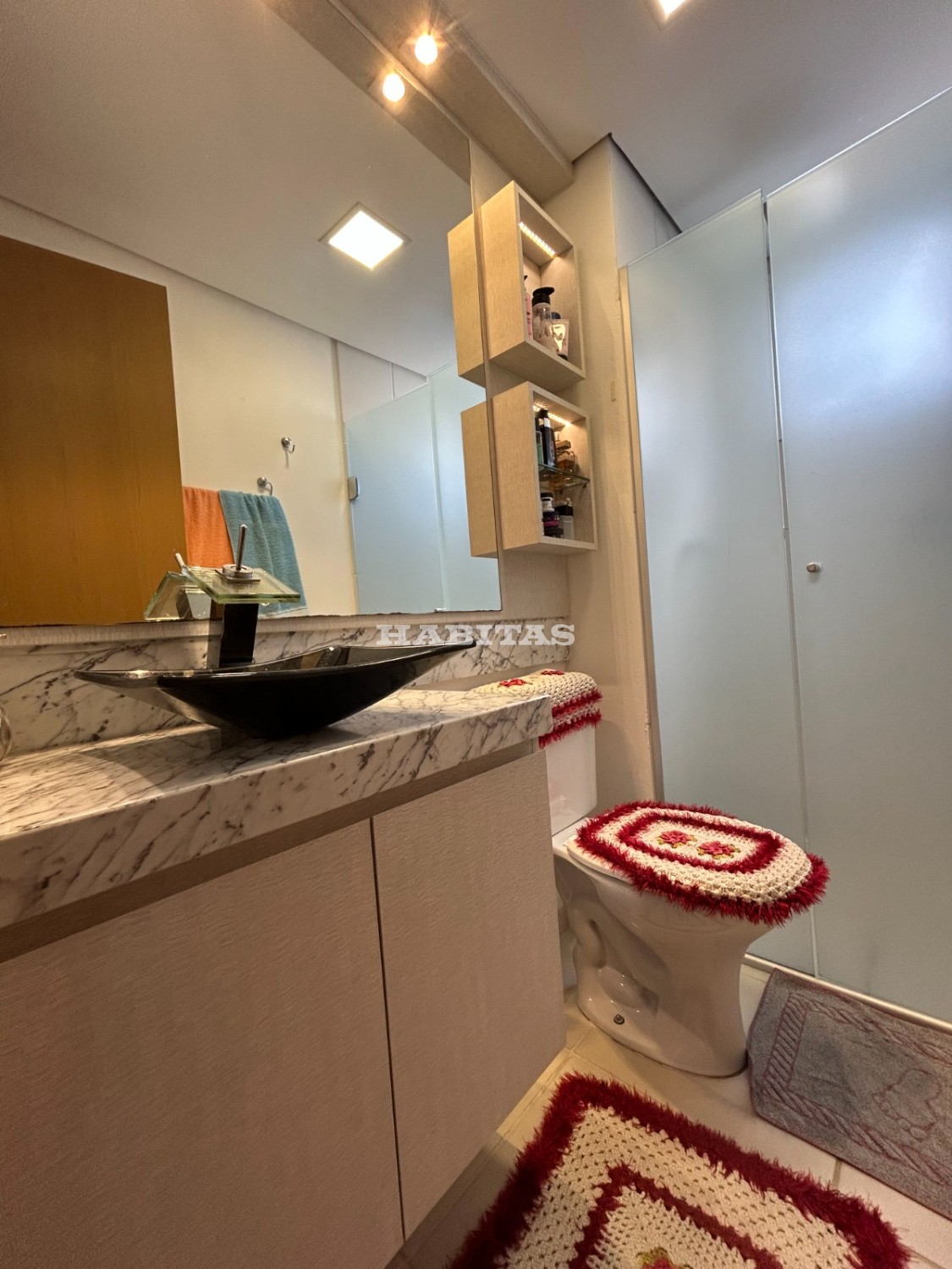 Banheiro: Móveis completos, cuba + torneira, box de vidro jateado, ducha