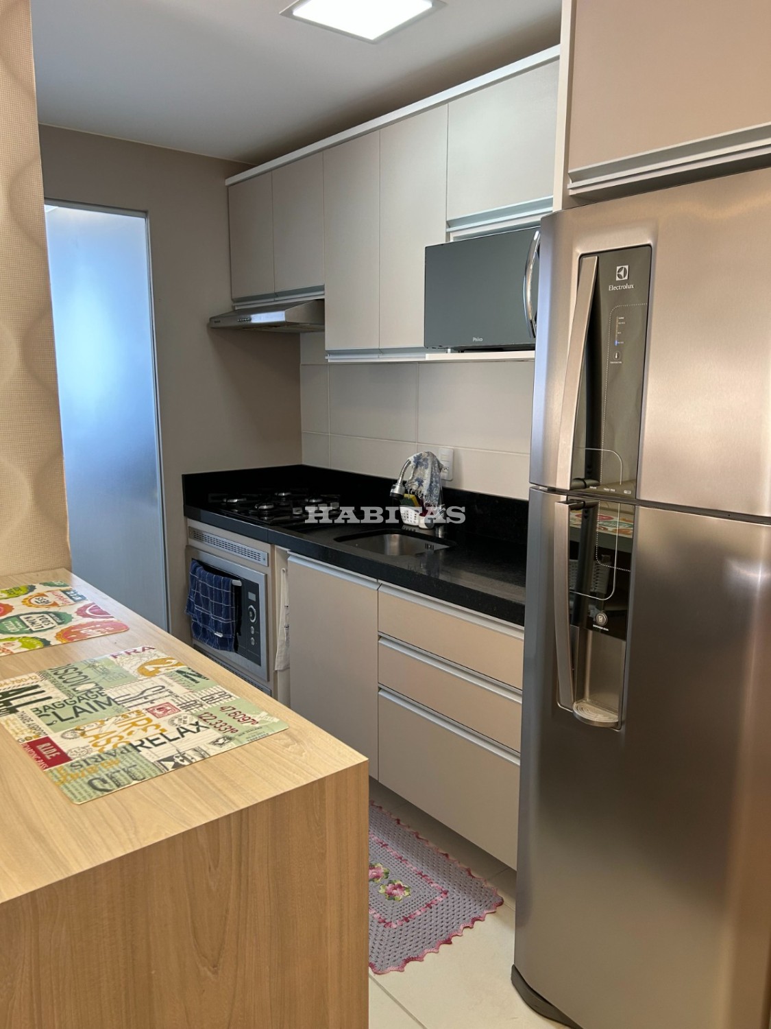 Cozinha: Móveis completos, depurador, 2 banquetas, forno elétrico, cooktop 4 bocas